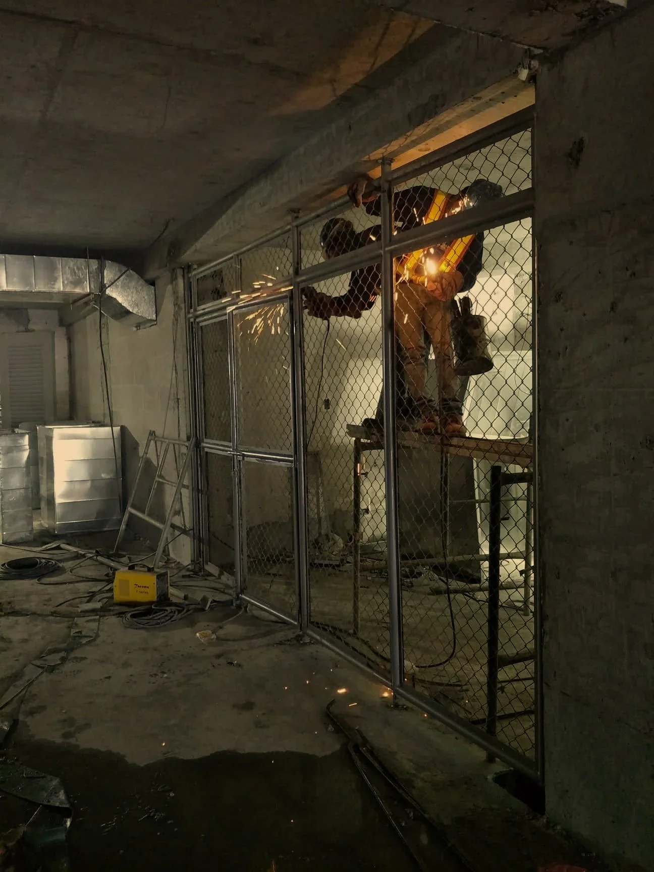 Construction site with a worker in safety gear inside a partially built structure with metal fencing and concrete floors.